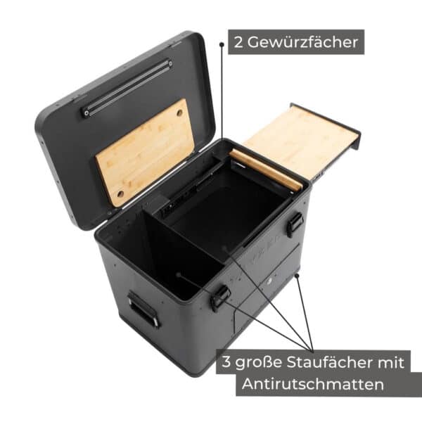 - Mit der Raumaufteilung und den durchdachten Features schaffst Du Ordnung in Deiner Camping Kochbox.