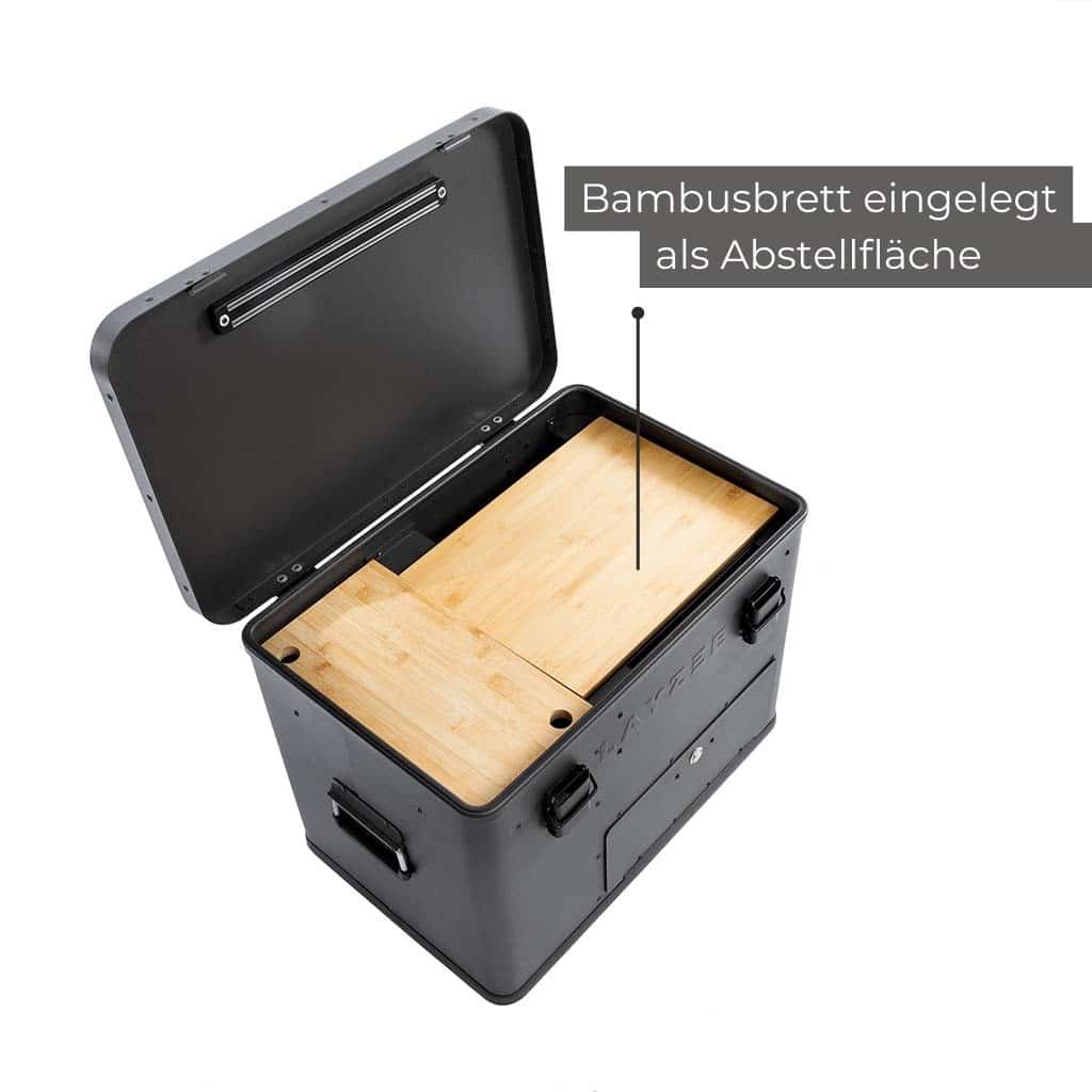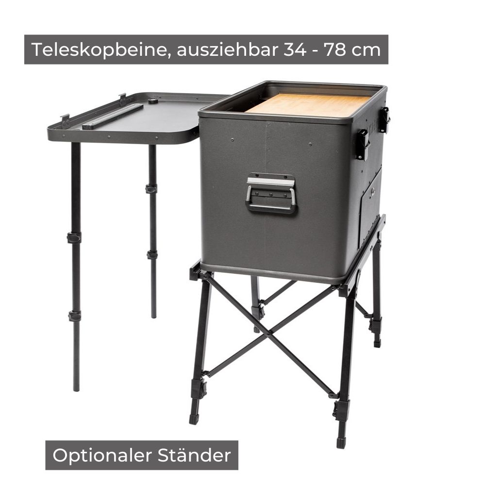 - Mit dem umgeklappten Küchenbox Deckel als Tischoption, hast Du Deinen Campingtisch immer dabei.
