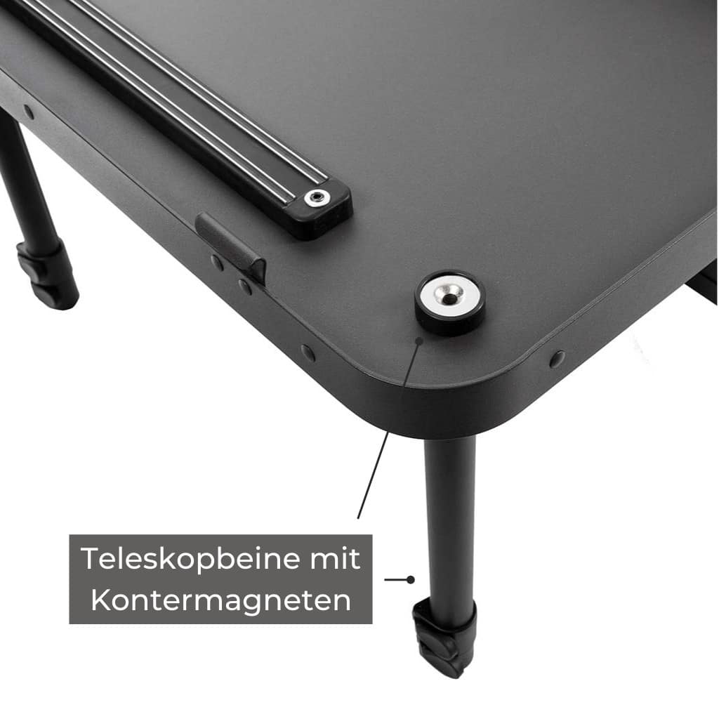Die Tischbeine sind bei der Lieferung im Fach unter dem Auszug verstaut und der schwarze Windstopper liegt unverpackt der Box bei.
