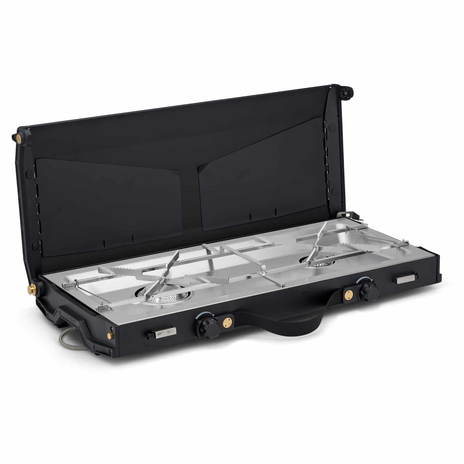 Der Alika Stove ist mit zwei unterschiedlich grossen Brennern ausgestattet, abnehmbaren Topfträgern, einer Auffangschale für einfache Reinigung und einem integrierten Piezo-Zünder. Der abnehmbare Deckel mit Eichenholzleisten verfügt über ausklappbare Windschutzwände und kann auch als Warmhalteplatte genutzt werden.